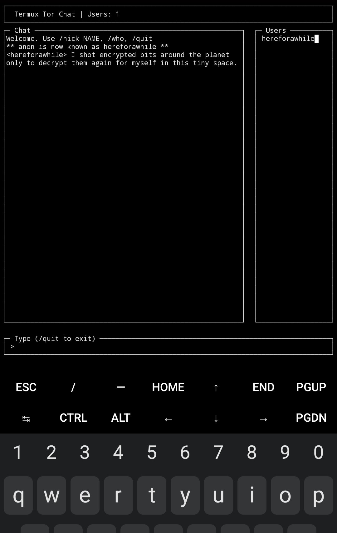 I did see some onion code in the script, but didn’t figure out that it was listening on an onion port. Cool. I’m not sure of the attraction of running it on a phone, but I’ll take your word for it ;). Do you actually use it? Yeah I can see wanting to reorganize it in some ways, and maybe try to use some more standard protocols (irc?) or a subset. Does tor not already provide its own crypto?