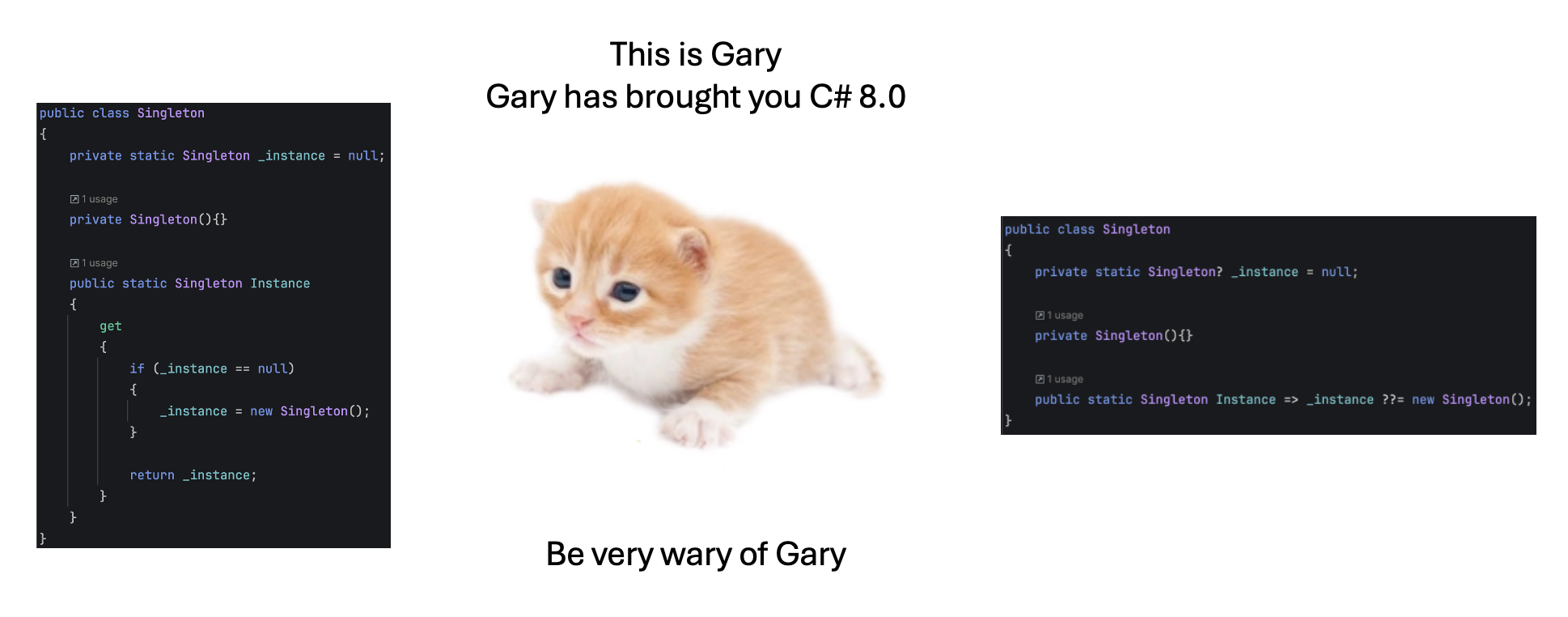 services.AddSingleton<X>. There’s plenty to criticize in C#, or any language, but this ain’t it. Most of the new language features just make the code shorter without loosing clarity. Really liking newer C# versions.Also, Lazy is thread safe. Gary’s code is not.