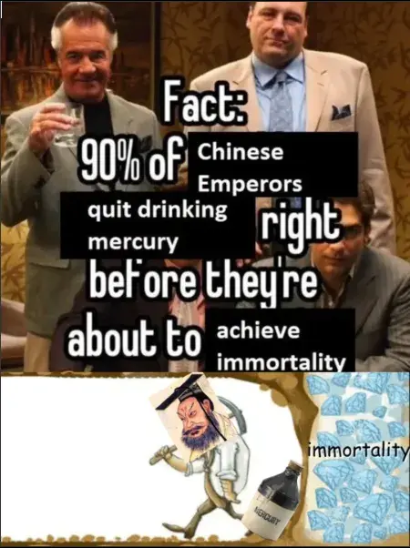 I hear that, but allegedly ground radar of the site from before China became China again showed that the mercury oceans around the Qin continents might be real, I want to believe it’s full on Indiana Jones shit, and you have all these Confucians drowned in a sea of mercury for failing to find him the elixir of immortality out on that irl sea