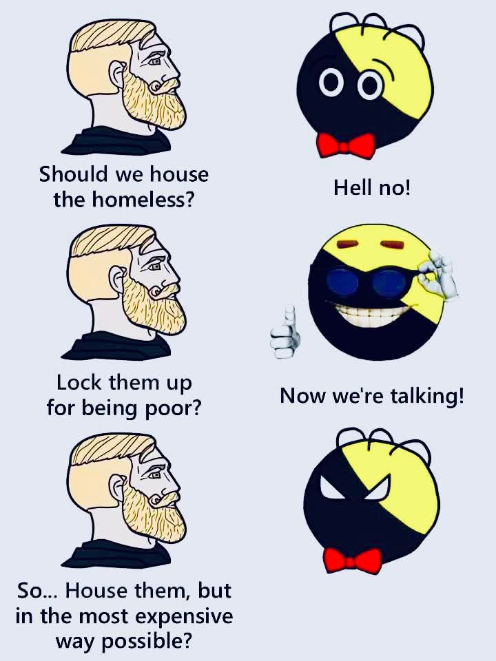 Part of the debacle of giving homeless people free homes, would make everyone else wonder why TF we’re working so hard for 90% of our net income to be sucked away by the housing industry just so we can keep a basic roof over our heads.