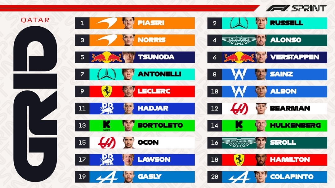 arrow-up18arrow-down1image2025 Qatar Grand Prix - Sprint Race Starting Gridpreview.redd.italphacyberranger@sh.itjust.works to Formula 1@lemmy.worldEnglish · 4 months agomessage-square0linkfedilink