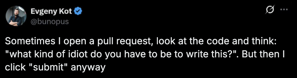 When doing pr reviews, I often also shrug and think: “If it breaks, it’s not my mess to clean up.” Then click Aporoved.