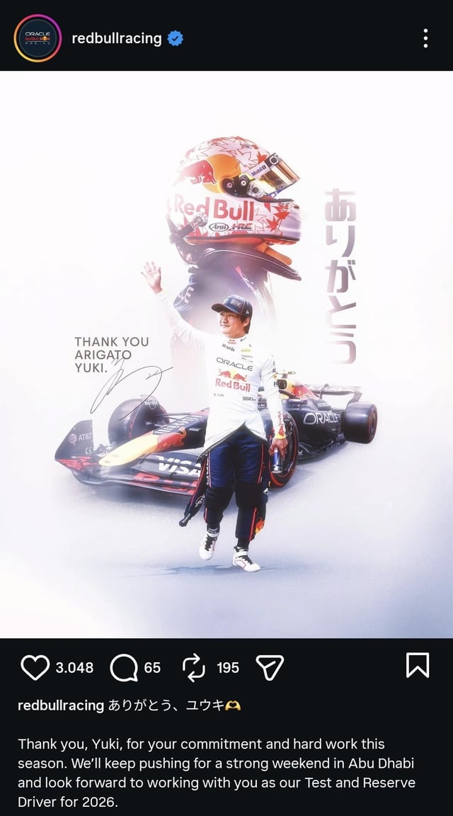 Sorry Yuki, you were snubbed at the end of last year to be the #2 driver, then quickly given the chalice once it was determined to be poisoned unless you were the chosen one. You had a great stint. Best of luck