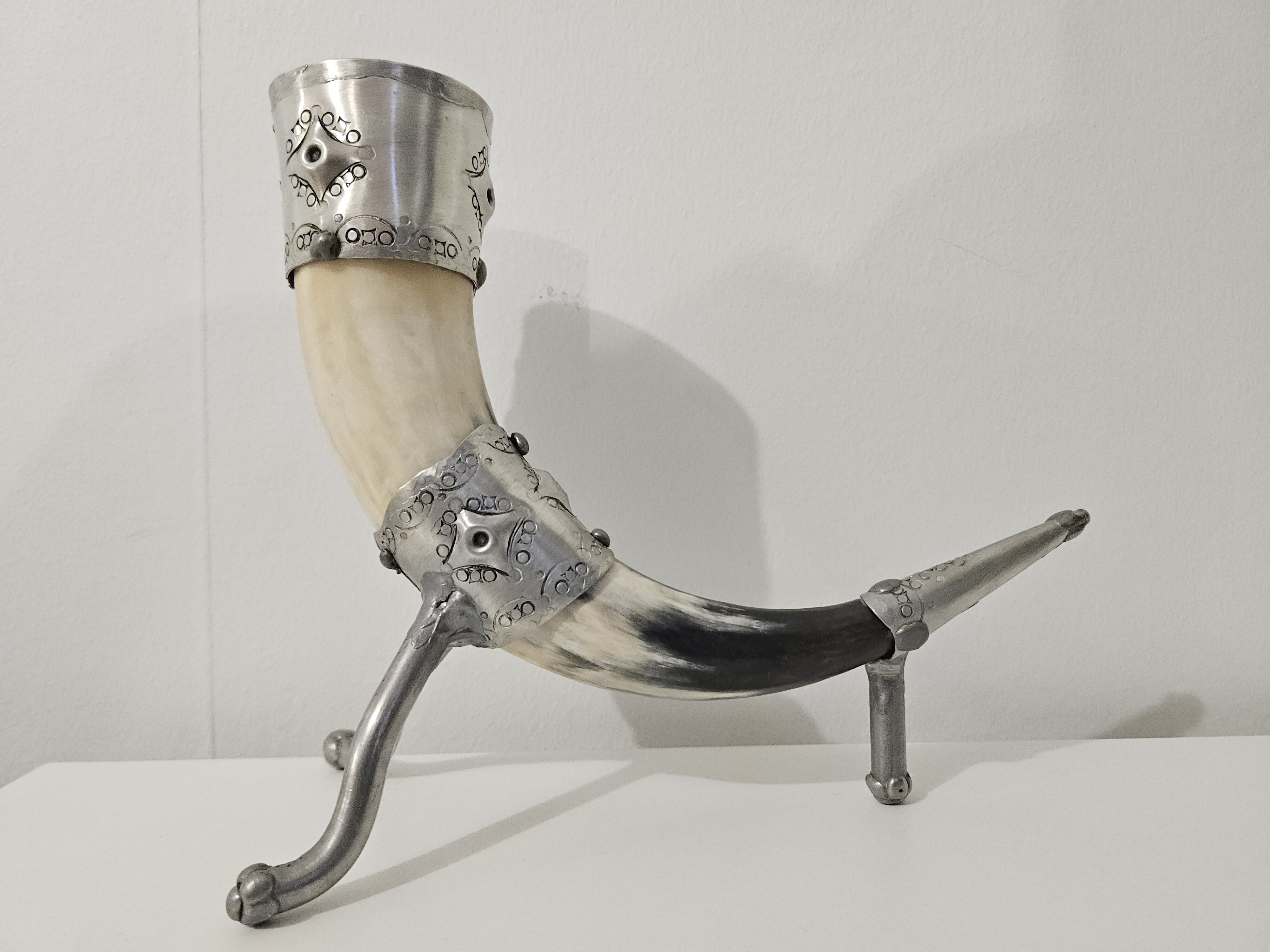 Bought this horn today at an antique shop and I’m trying to find out when it was made, by whom and how/with what materials? I know that the metal parts are made of tin because these are sometimes called “tin horns”. There are no initials or any readable or otherwise discernable engravings on the horn or on the tin parts. A reverse image search lead me to an old auction that was concluded a while ago: https://www.tradera.com/item/341133/705890164/dryckeshorn-cornucopia-tenn-och-horn-norge