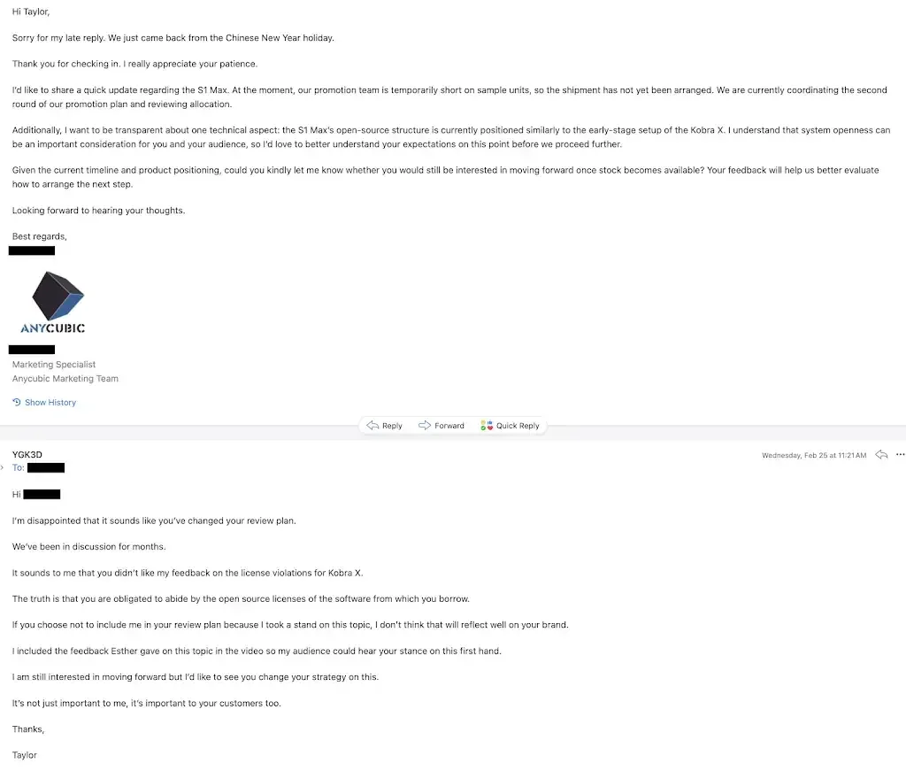 This is the emails between the YouTuber YGK3D and Anycubic, it seems like they won’t send 3D printers to reviewers who mention their GPL3 license violations.