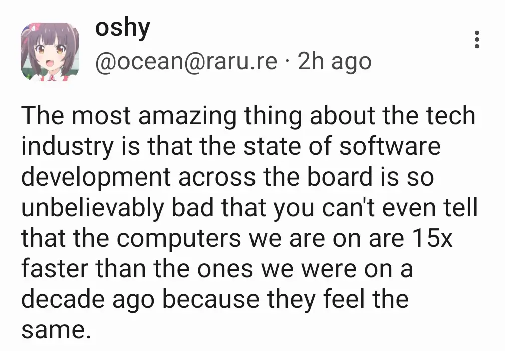 Thought leaders spent the last couple of decades propaganding that features-per-week is the only metric to optimize, and that if your software has any bit of efficiency or quality in it that’s a clear indicator for a lost opportunity to sacrifice it on the alter of code churning.