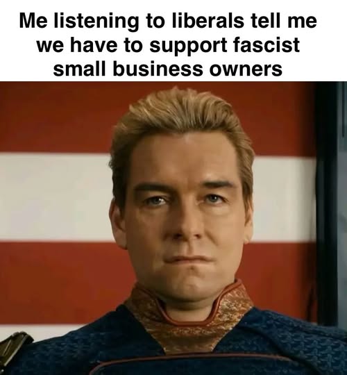 I agree with OP and frankly if you think liberals don’t support fascist small business owners, or worse you also support them, then I sure hope you don’t think of yourself as a leftist. But I have to admit I did raise an eyebrow at the choice of character used to express the sentiment.