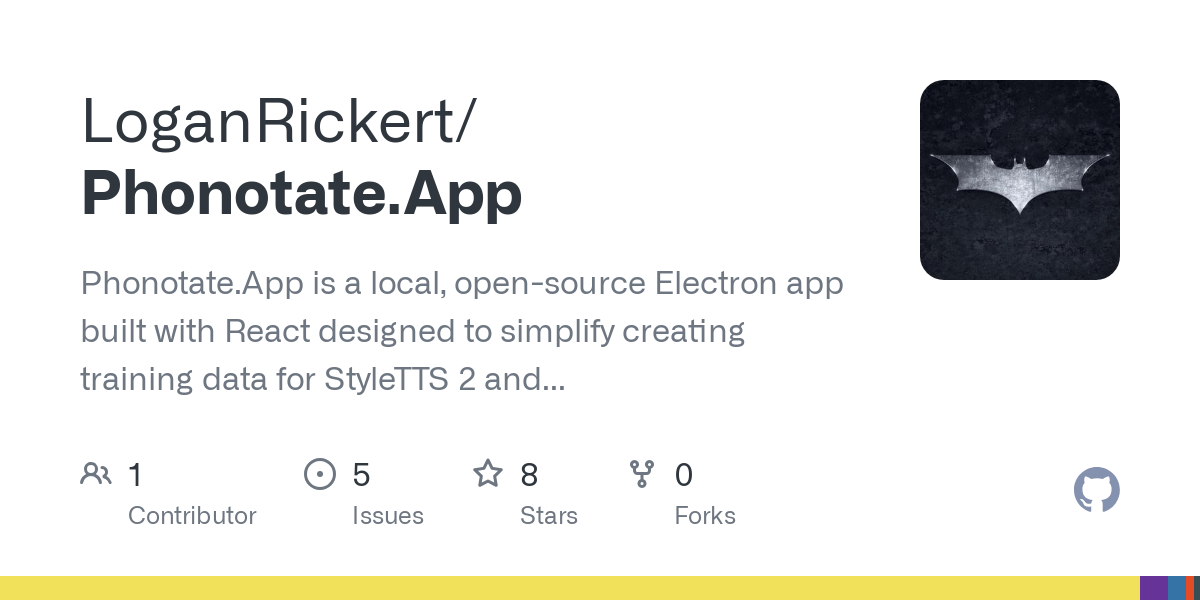 Phonotate.App is a local, open-source Electron app built with React designed to simplify creating training data for StyleTTS 2 and voice cloning models. Phonotate provides a seamless workflow for recording, analyzing, and managing voice samples. Whether you use open-source backend services or OpenAI APIs, this app ensures that all your data remains secure and within your control.