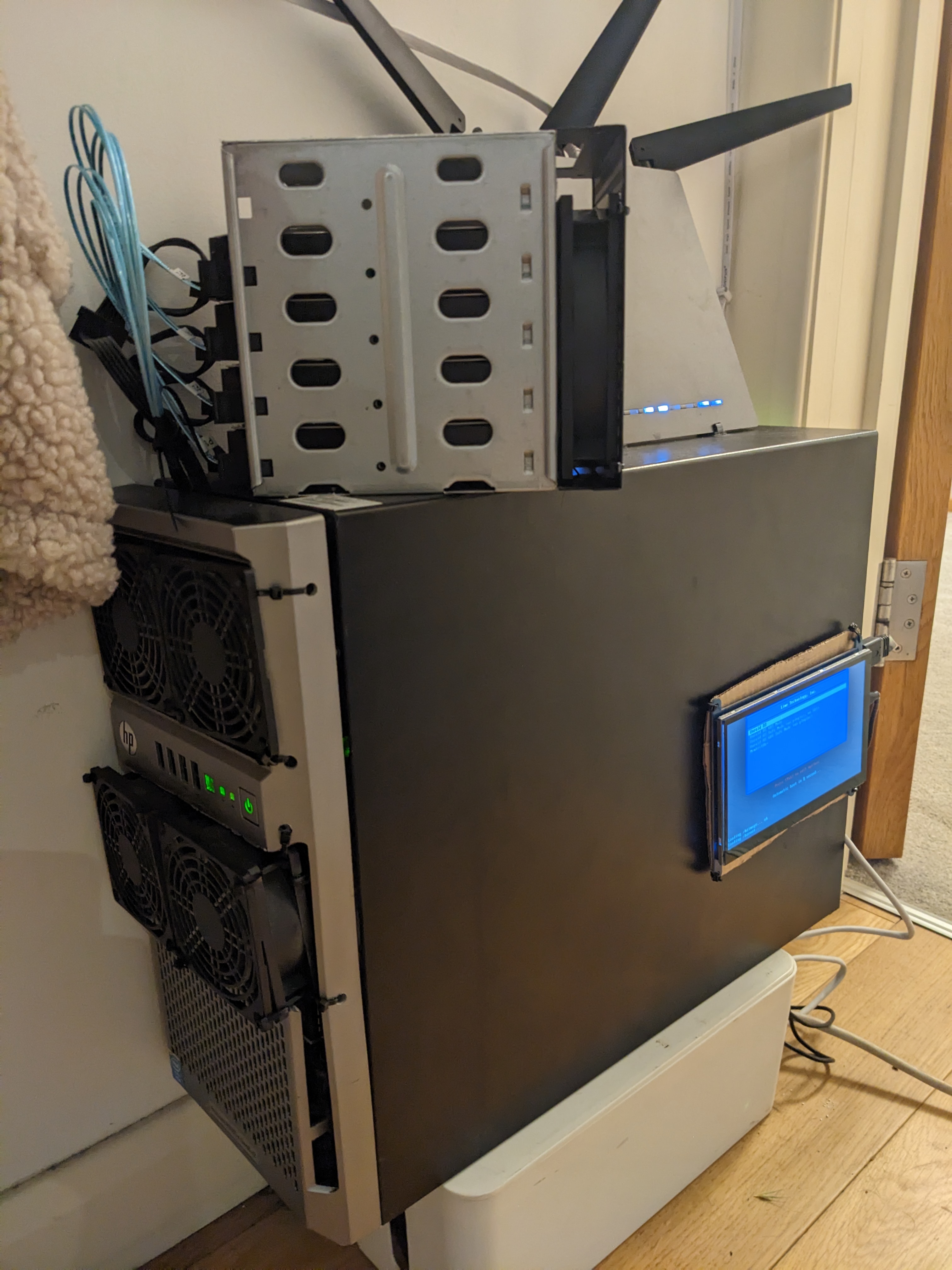Specs are slightly in flux right now, but basically it’s an HP ML310e Gen 8, with a random HDD cage on top for 4 additional drives, and a bunch of fans zip tied to the front to cool the 6 internal drives. Oh, and a little 7" display stuck to the side which I’ll get a stats readout on soon.