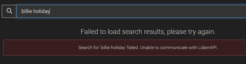 [Warn] LidarrErrorPipeline: NzbDrone.Core.MetadataSource.SkyHook.SkyHookException: Search for ‘billie holiday’ failed. Unable to communicate with LidarrAPI. [v2.11.2.4629] NzbDrone.Core.MetadataSource.SkyHook.SkyHookException: Search for ‘billie holiday’ failed. Unable to communicate with LidarrAPI.