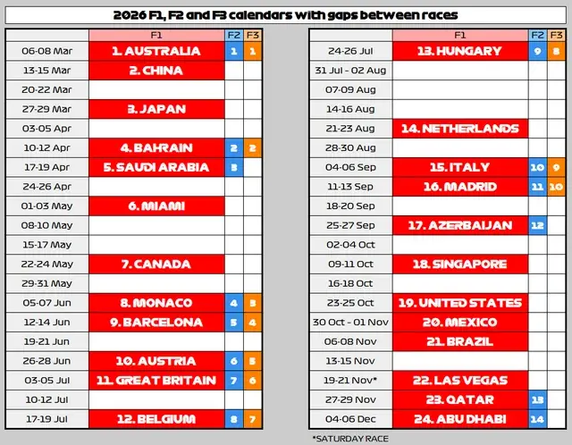 arrow-up115arrow-down1image2026 F1, F2 and F3 calendars with gaps between racessh.itjust.worksalphacyberranger@sh.itjust.works to Formula 1@lemmy.worldEnglish · 6 months agomessage-square1linkfedilink