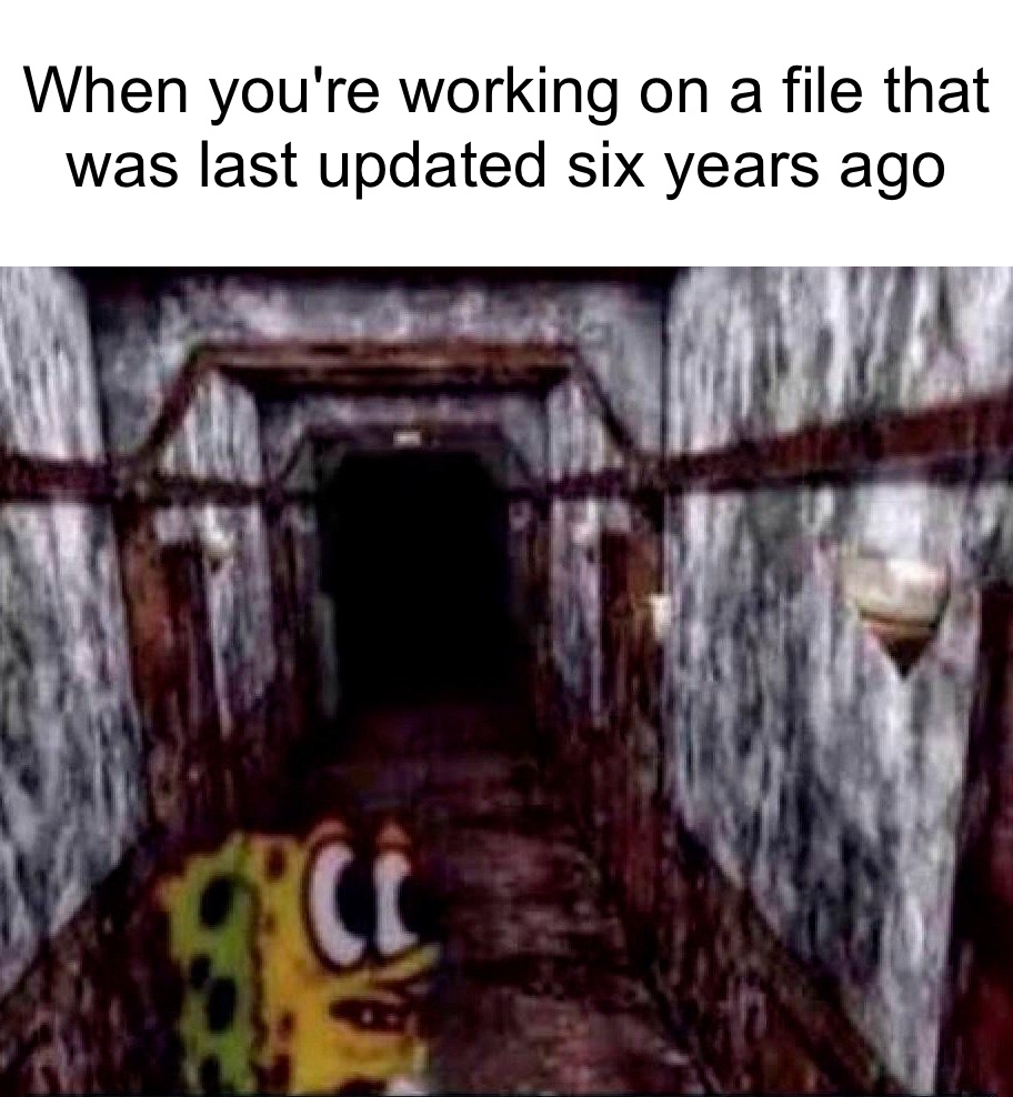 arrow-up1444arrow-down1imageWhen you're working on a file that was last updated six years agolemmy.mlcm0002@lemmy.cafe to Programmer Humor@programming.devEnglish · 6 months agomessage-square22linkfedilink