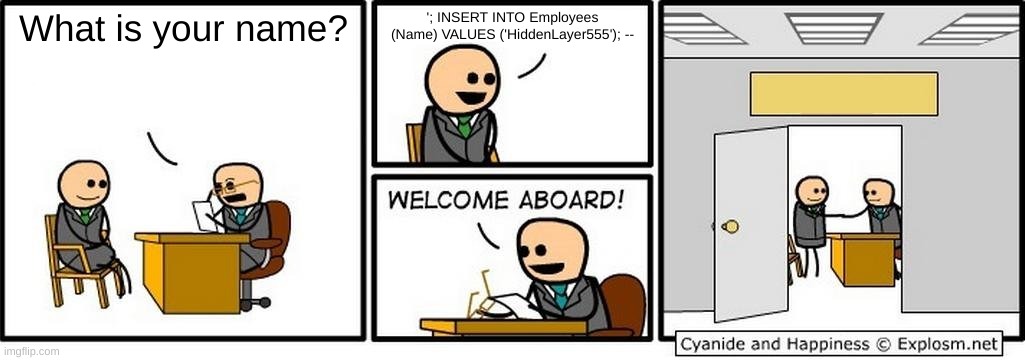 arrow-up1269arrow-down1imageSQL Injectionlemmy.mlHiddenLayer555@lemmy.ml to Programmer Humor@programming.devEnglish · edit-28 months agomessage-square18linkfedilinkfile-text