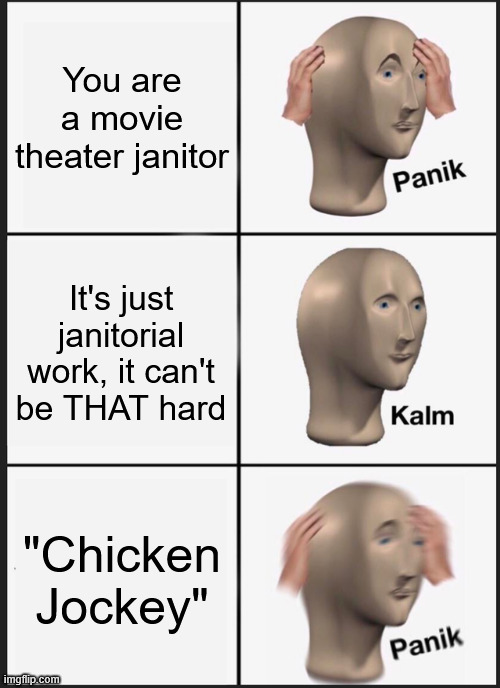 I swear whenever a movie theater janitor hears the phrase “Chicken Jockey!” from now on they’re gonna get PTSD flashbacks 💀