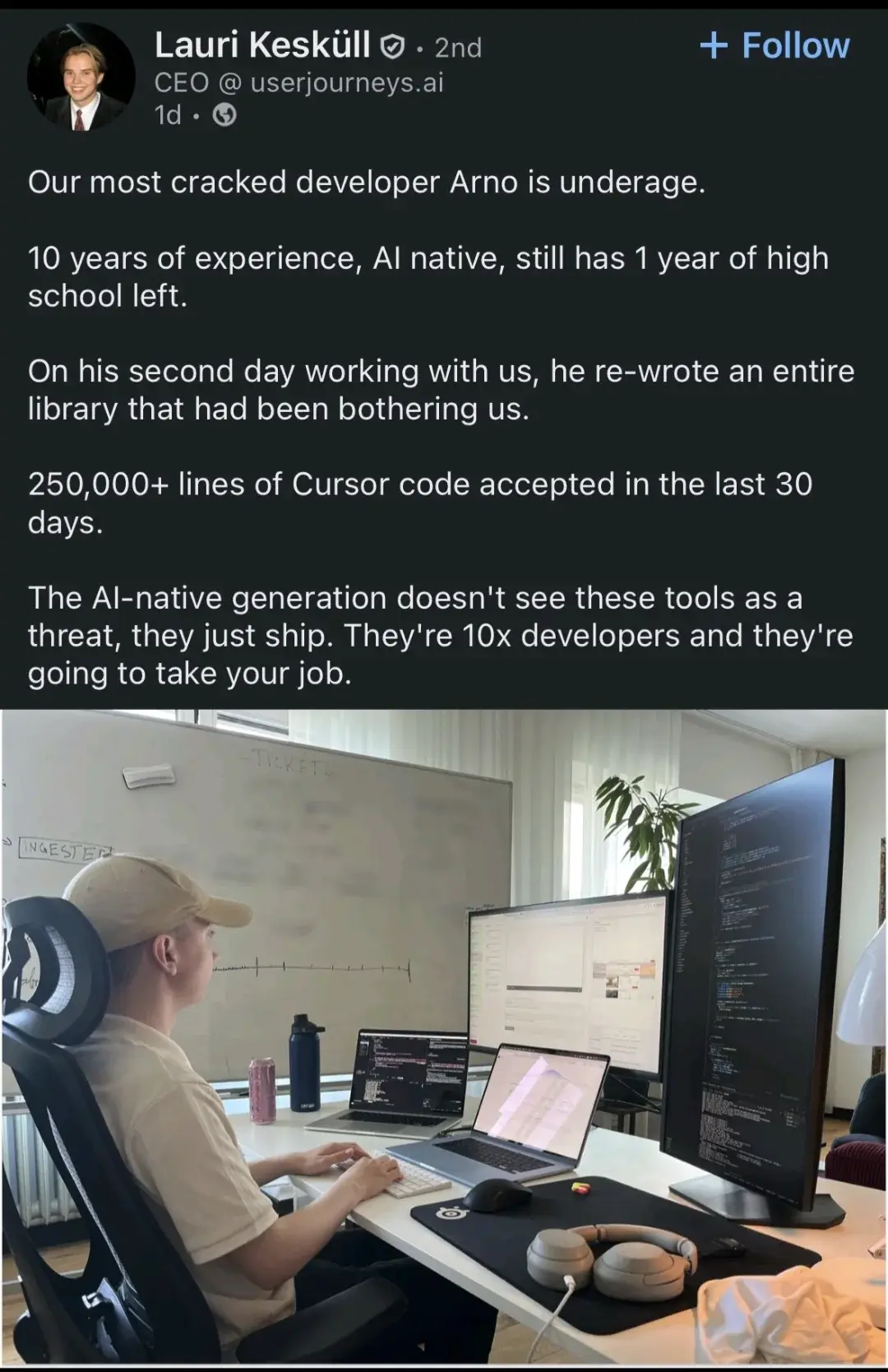 This kid doesn’t know what he’s writing or why, he’s just coaxing cursor to vomit up commits and apparently that’s their only metric for success.