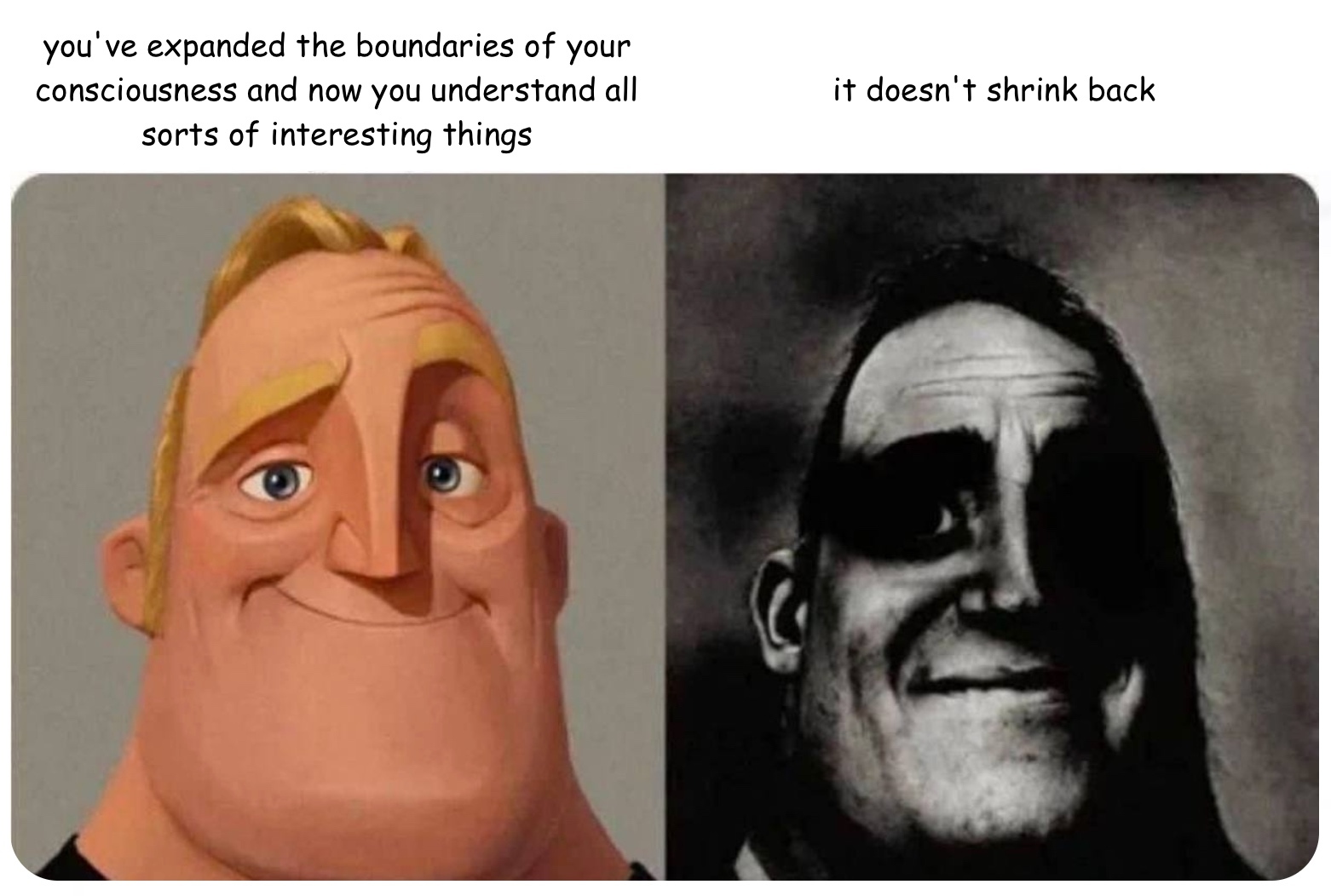 oh yeah, i loved it when i got somewhat better from my own internal haze (depression and bpd and anxiety and shit) only to realize the world’s actually gone to shit, and now i can clearly see what and why and how.